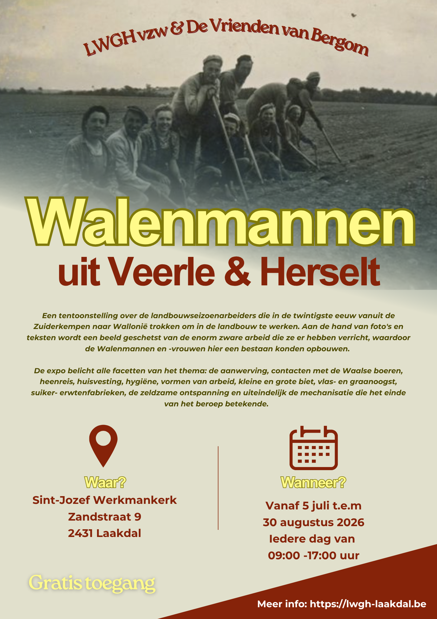 Van zondag 5 juli tot zondag 30 augustus 2026 loopt in de kerk van Veerle-Heide (Laakdal) een tentoonstelling over de landbouwseizoenarbeiders die in de twintigste eeuw vanuit de Zuiderkempen naar Wallonië trokken om in de landbouw te werken. De aanleiding is het 20-jarig bestaan van het monument De Walenman op het dorpsplein. Aan de hand van foto’s en teksten wordt een beeld geschetst van de enorm zware arbeid die ze er hebben verricht, waardoor de Walenmannen en -vrouwen hier een bestaan konden opbouwen.